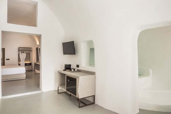 Their size amounts to 50sqm. An ode to local architecture with a modern twist, each of these rooms features traditional vaulted ceilings, frugal whitewashed interiors and rough-hewn stone king-size beds, complemented with unsurpassed sea views.