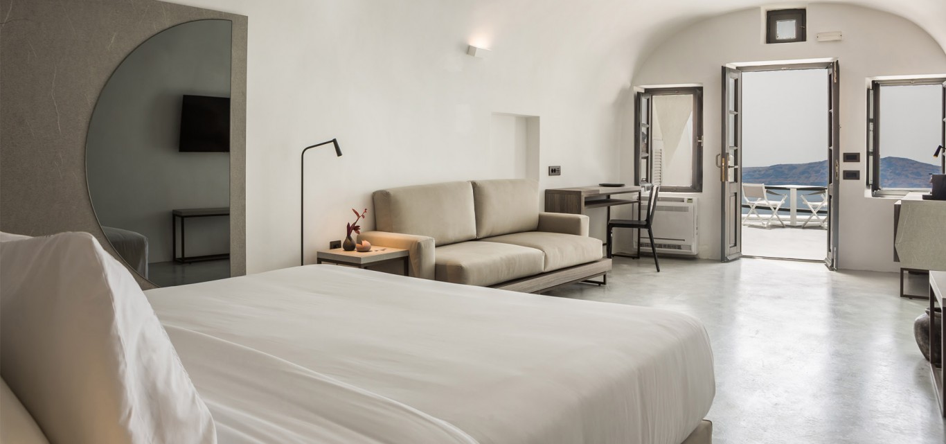 Their size amounts to 50sqm. An ode to local architecture with a modern twist, each of these rooms features traditional vaulted ceilings, frugal whitewashed interiors and rough-hewn stone king-size beds, complemented with unsurpassed sea views.